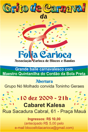 na quinta-feira, dia 10 de dezembro, a nova Liga de Blocos e Bandas do Rio de Janeiro, da qual o Empolga faz parte, Folia Carioca, dará seu primeiro grito de carnaval. O balaco acontece no Cabaré Kalesa, a partir das 21 horas e o ingresso é baratinho. Infelizmente esse dia o Empolga estará tocando num outro evento, mas o grupo Nó Molhado fará as honras da Liga. Segue o flyer em anexo. Todos lá!